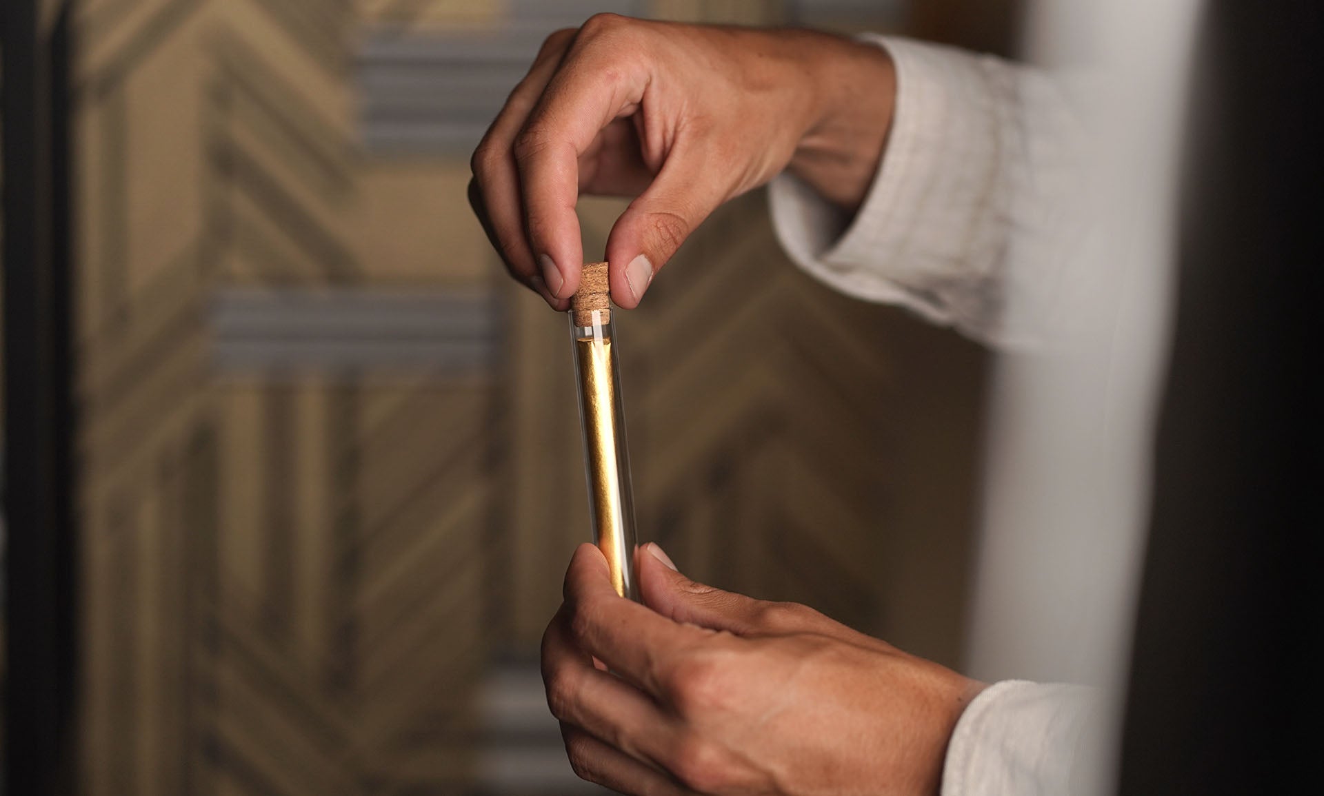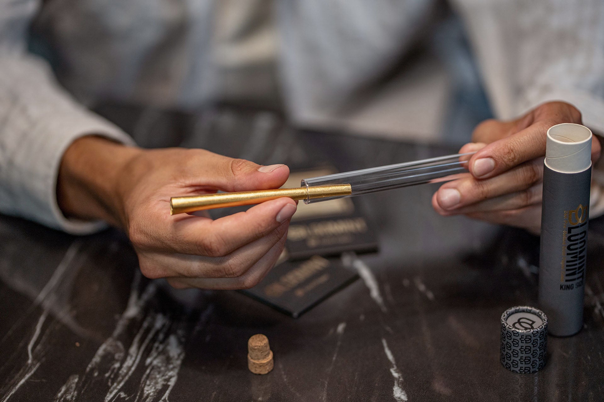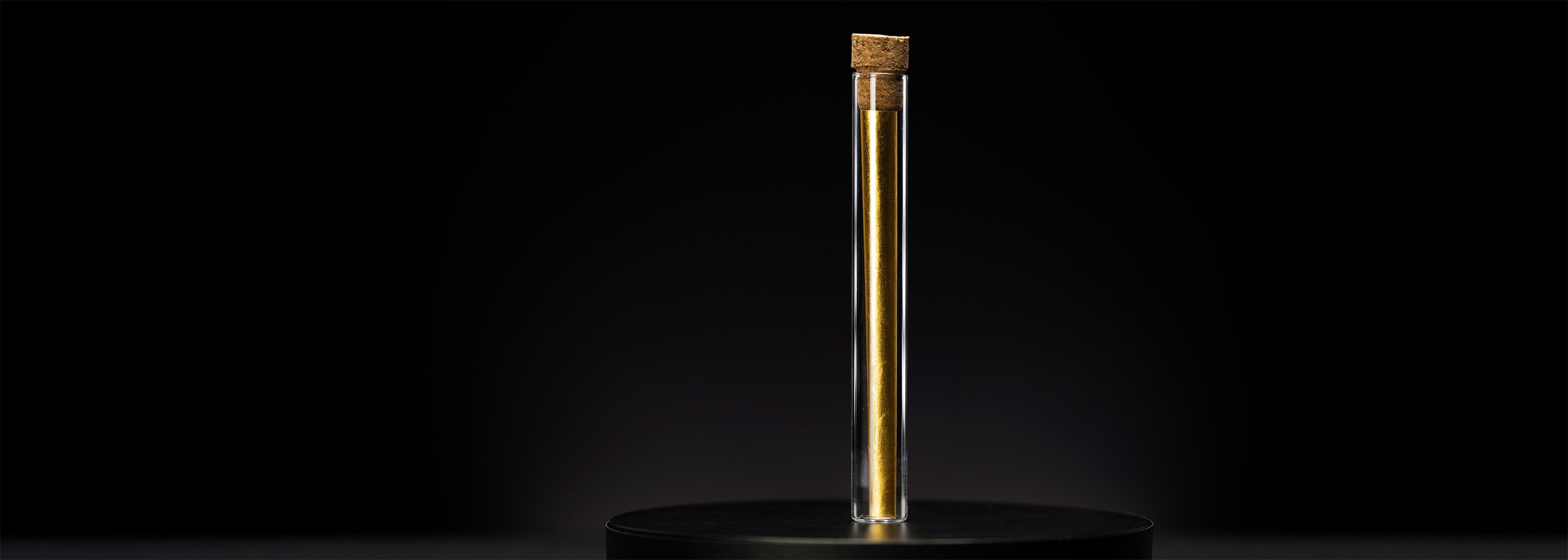 Jede Packung enthält 1 vorgerollte Cone mit 24 Karat Goldbeschichtung, sicher verpackt in einem Glasröhrchen.