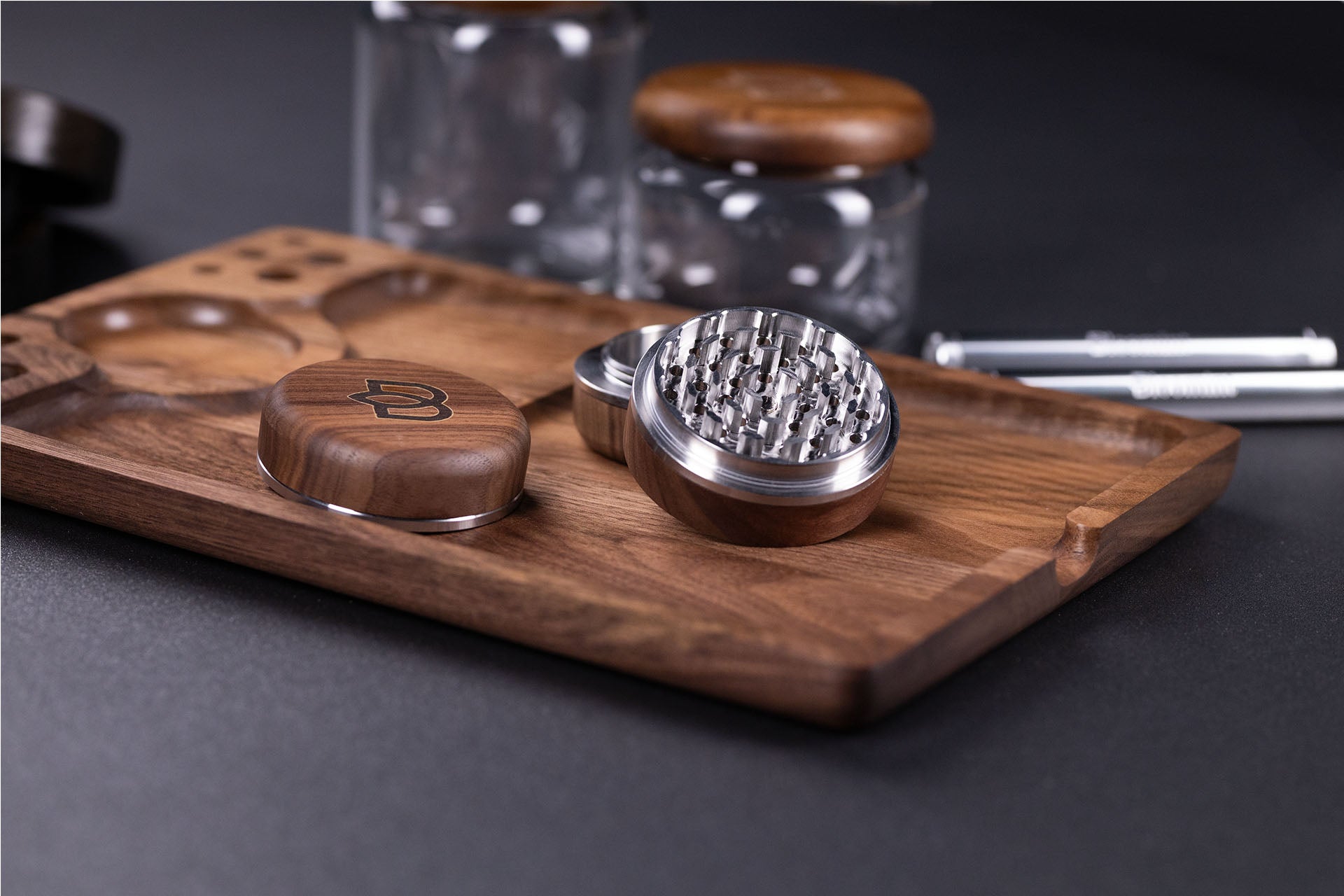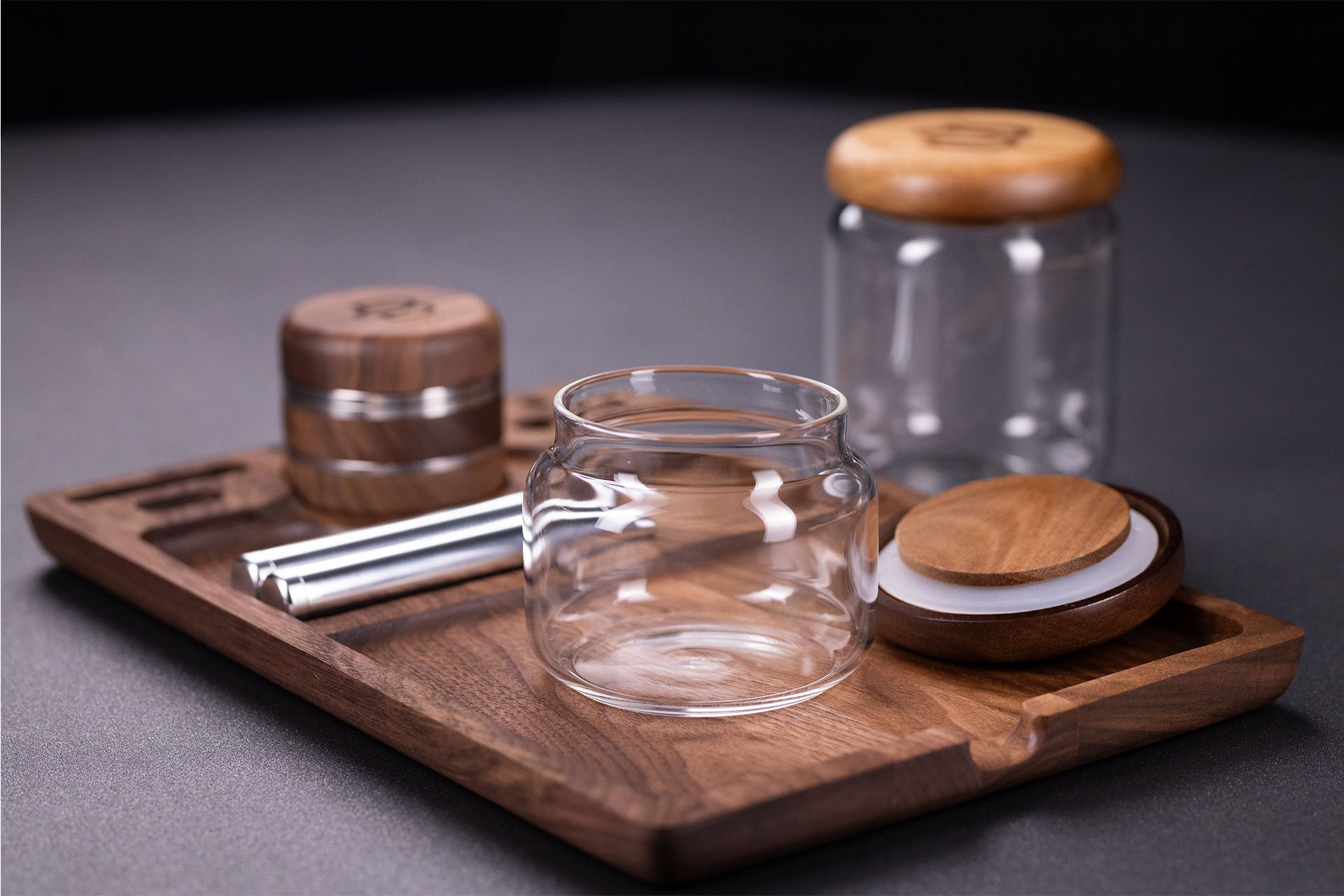 Der Edelstahlgrinder mit Walnussholz-Elementen liefert feine Ergebnisse und ist besonders langlebig. Zwei luftdichte Aufbewahrungsgläser (220 ml und 380 ml) halten deine Kräuter frisch, während die Cone-Cases und der Becher das Set abrunden.