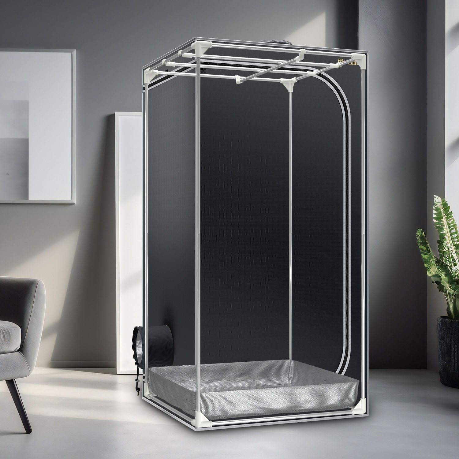 Zusätzlich schützt ein Bodeneinsatz vor dem Austritt von Flüssigkeiten. Dadurch bleibt das Growzelt sauber und die Wartung wird erleichtert.